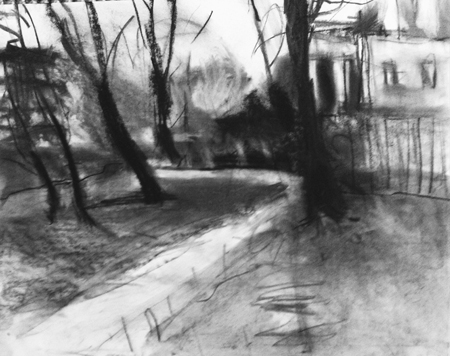 The charcoal works on paper, explore ever changing rhythms in moving water, or the tracery of bare branch winter trees. Sweeping lines through shaded monochrome colour, convey an atmosphere of depth and space.