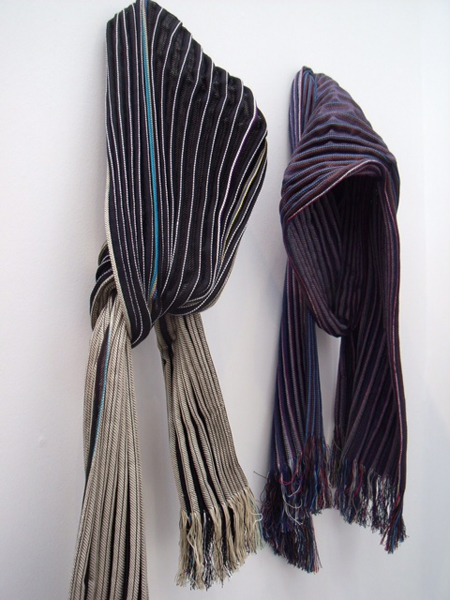 Makeba's exquisitely coloured silks are woven into self pleating, generously proportioned scarves. Some incorporate metallic threads allowing the wearer to mould the scarf into dramatic, ribbed sculptural forms around the body.