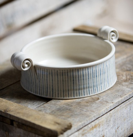 On the principle that form follows function, the sole embellishment to the strong clean lines of his extensive range of richly glazed stoneware, is their distinctive trademark scrolled handles.