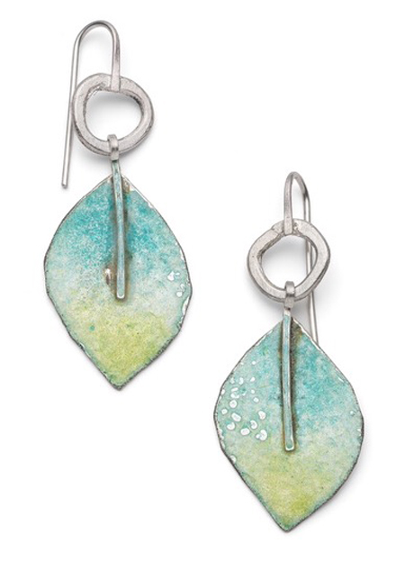 Nancy hand cuts and enamels silver and copper elements, frequently in combination with pearls and semi precious stones which she intersperses with tiny flag like silver forms. Each one is individually decorated with enamels in a varied palette of pretty colour and pattern, which Nancy hangs like festive pennants to form her very wearable earrings and necklaces.
