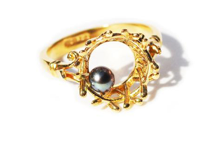 Nobuko draws on memories of her collection of small found objects toys, and fragments of mosaic from her artist grandmother's studio. Kept and treasured during her childhood in Japan, these objects now inform the often complex designs of her small scale, delicately worked, precious metal jewellery.