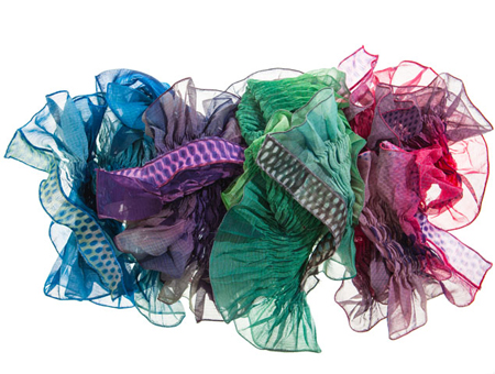 Wendy's gloriously coloured scarves, wraps and belts are hand printed on diaphanous man made fabric, featherlight fleece, and softest leather. Painterly abstract designs are permanently transferred from paper to fabric by a heat activated process.