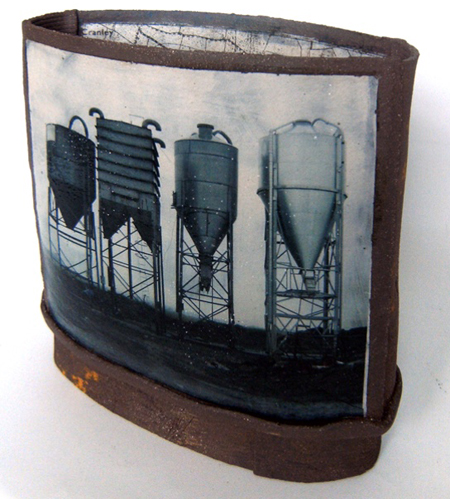The vessels, illustrated with her (sometimes digitally altered) photographs and often with maps indicating the source of the photos, are built from the printed slabs, lightly glazed, and fired in an electric kiln to 1240 C. More recently she has also added laser transfers to the fired surface, allowing for finer detail of imagery.